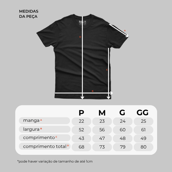 Encolhimento: As camisetas basic são submetidas a um processo de pré-encolhimento, que reduz significativamente o risco de encolhimento durante as lavagens. Contudo, devido às características naturais do algodão, é esperado um leve encolhimento de 1 a 3 cm nas medidas após a primeira lavagem. Vale destacar que nenhum processo têxtil de pré-lavagem é capaz de eliminar completamente o encolhimento posterior.